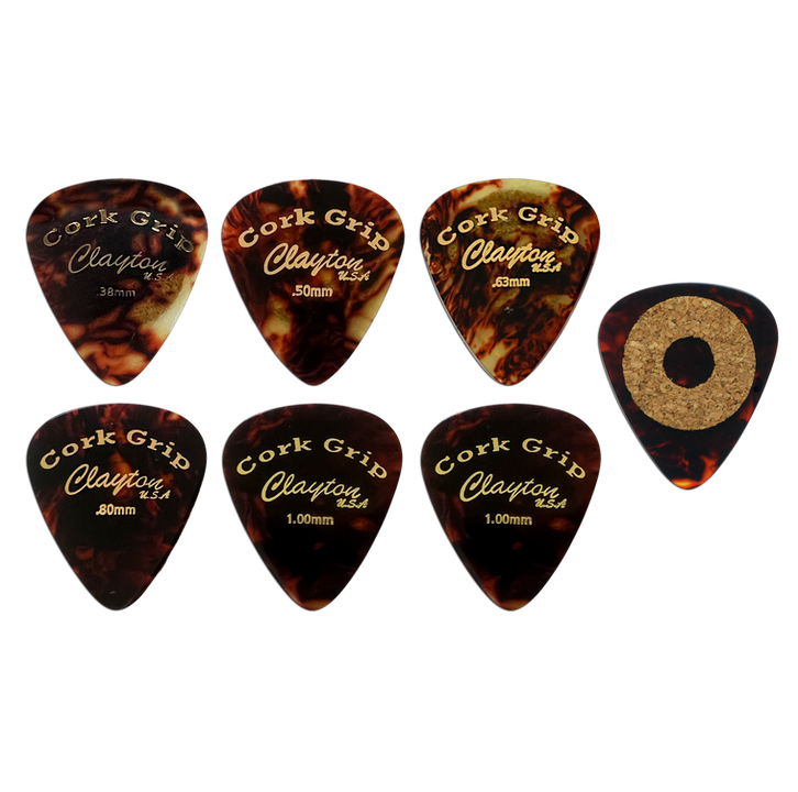 The Clayton Cork Grip pick a retro favorite sure to enhance your performance . Made from premium tortoiseshell celluloid, it offers both stunning vintage style and unmatched performance. The unique cork cushioning ensures a firm grip, allowing you to maintain perfect control with every strum. No more slips—just pure precision and comfort. Designed for musicians who value both reliability and classic design, this pick is the ideal blend of timeless aesthetics and modern playability. Available in 6 different gauges.